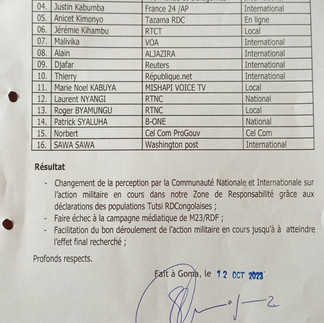 The document outlines a press tour to Kitshanga and surrounding areas, a move clearly intended to steer media coverage in favor of the Congolese government’s narrative. A roster of selected journalists from prominent outlets—both local and global—were enlisted to promote a government-approved storyline, effectively countering reports from groups like the M23 rebel faction. Among the media entities named are TV5Monde, FRANCE24, Reuters, Aljazeera , VOA, washingtonpost, and RTNC, alongside TazamaRDC, signaling an ambitious campaign to dominate global reporting on the crisis.